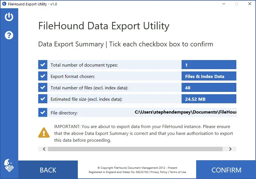 The FileHound Export Utility allows FileHound Administrators the ability to run a secure document and data extraction tasks for alternative back-up and recovery purposes. This application will download all documents and/or meta data saved in FileHound based on the filters you choose. The metadata will be exported in both JSON and XML formats.